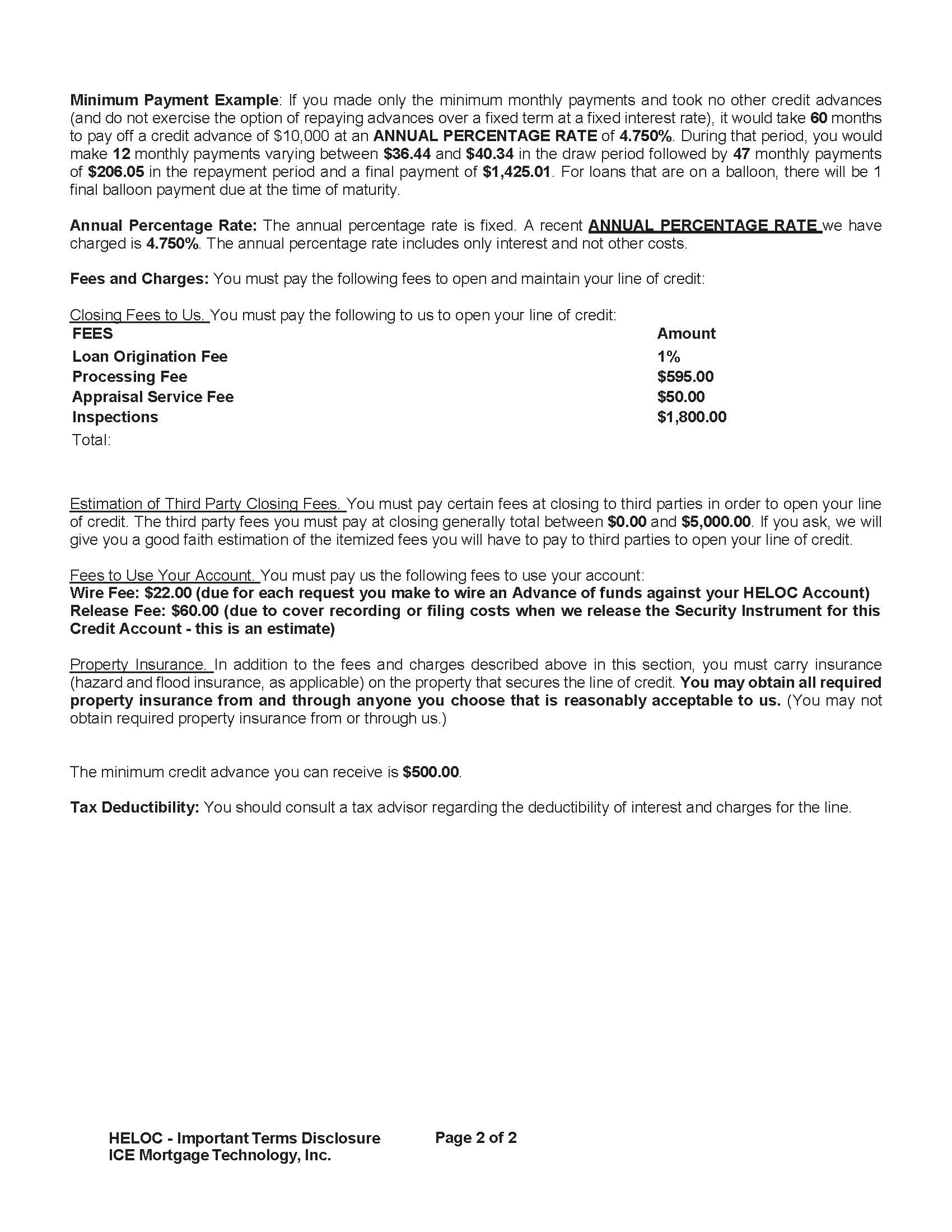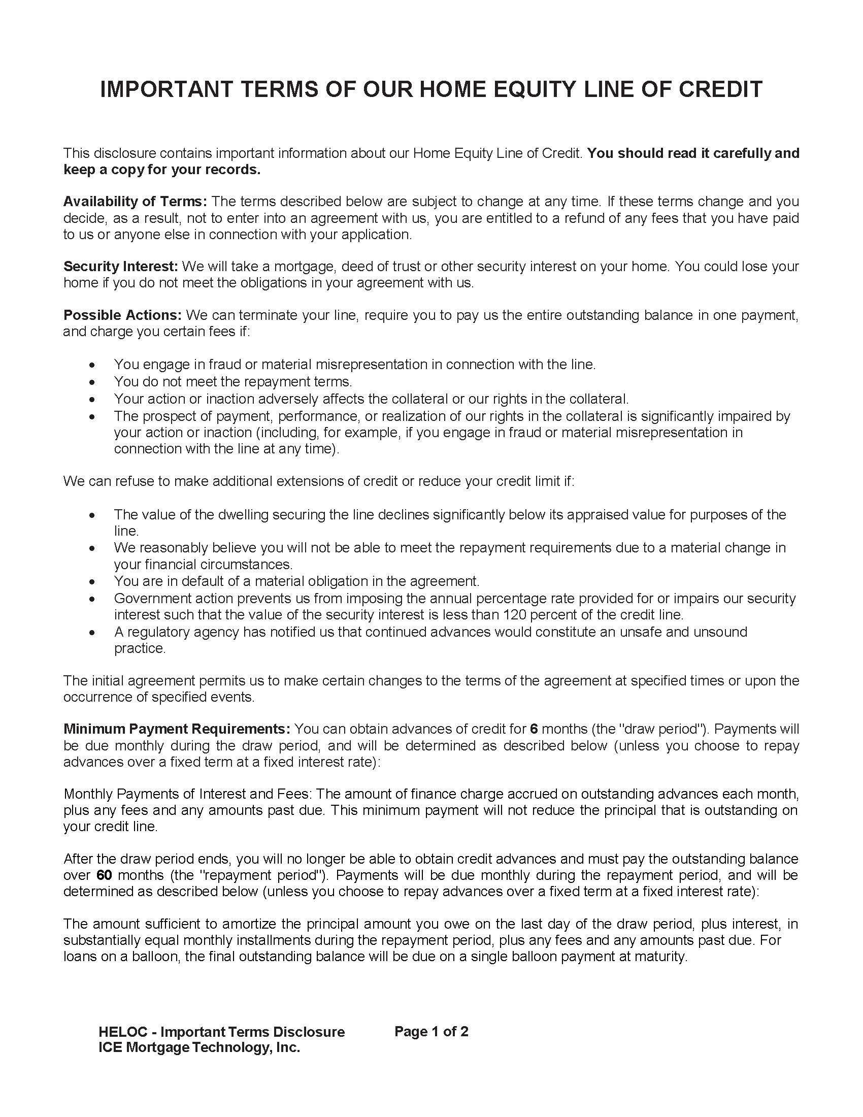 IMPORTANT TERMS OF OUR HOME EQUITY LINE OF CREDIT